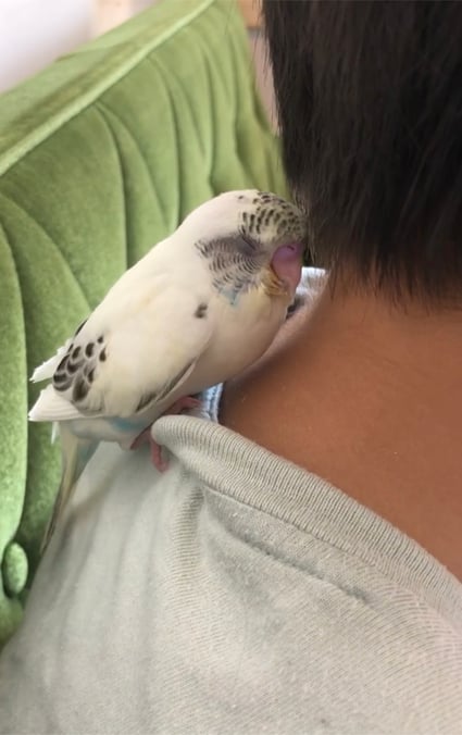 肩乗りインコに憧れていたあっちゃん。