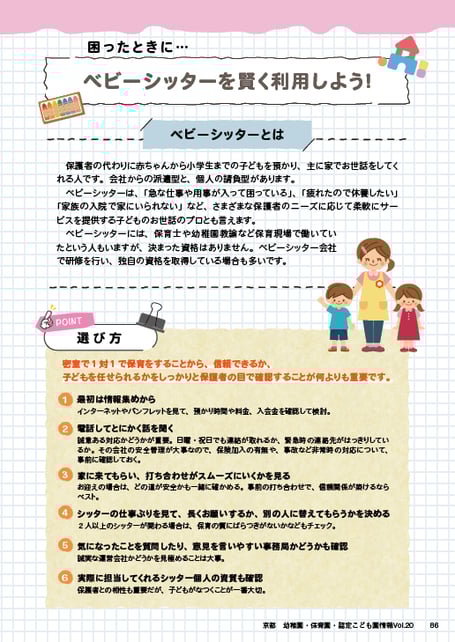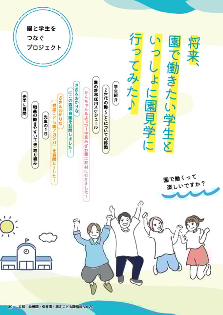 今号では、特集「園と学生をつなぐプロジェクト」として、「将来、園で働きたい学生といっしょに園見学に行ってみた♪」を掲載。「職場」として園を見つめることで、先生の仕事や先生の思いに迫ります。園の新たな魅力を発掘する新感覚の企画!